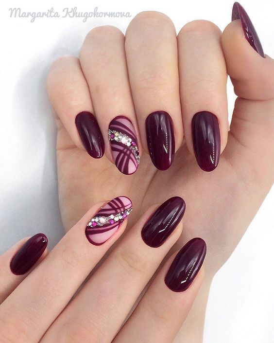 Выкладка нескольких камней на акцентных пальцах не менее актуальна и более востребована, выглядит стильно и элегантно. Стоит обратить особое внимание на фиолетовый и зеленый маникюр со стразами. Искрящиеся элементы придают глубоким оттенкам более эффектный вид.