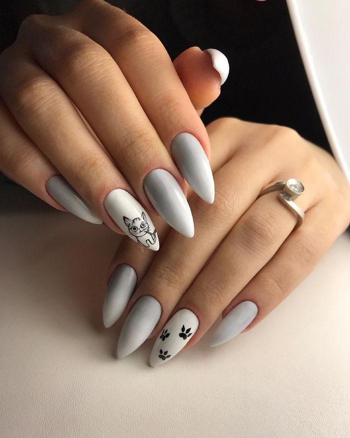 - Человеческие и животные силуэты. Все чаще в маникюре с белым лаком мастерами создаются великолепные рисунки с силуэтом или лицом девушки, подчеркивая этим утонченность женского образа. А вот с рисунками животных в белом маникюре нужно быть осторожным. Кроме бабочек и птичек с белым маникюром гармонируют кошечки, панды и еноты.
