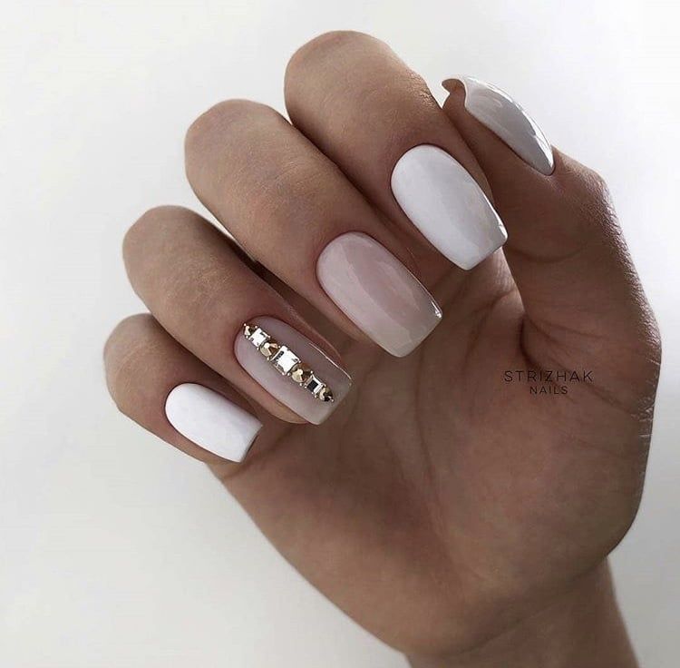 Эта супер милая идея с белыми ногтями сделает ваши ногти достойными сказочной принцессы. Блеклая блестящая розовая основа в сочетании со сверкающими бриллиантовыми стразами создает супер запоминающийся и игривый образ.
