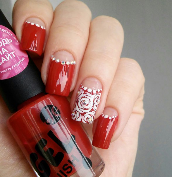 Жидкие камни, кристаллы сваровски или глиттерные блики в красном цвете смотрятся еще более роскошно. Маникюр с камушками приглянется не только невестам, но и леди, готовящимся к торжественным выходам в свет.