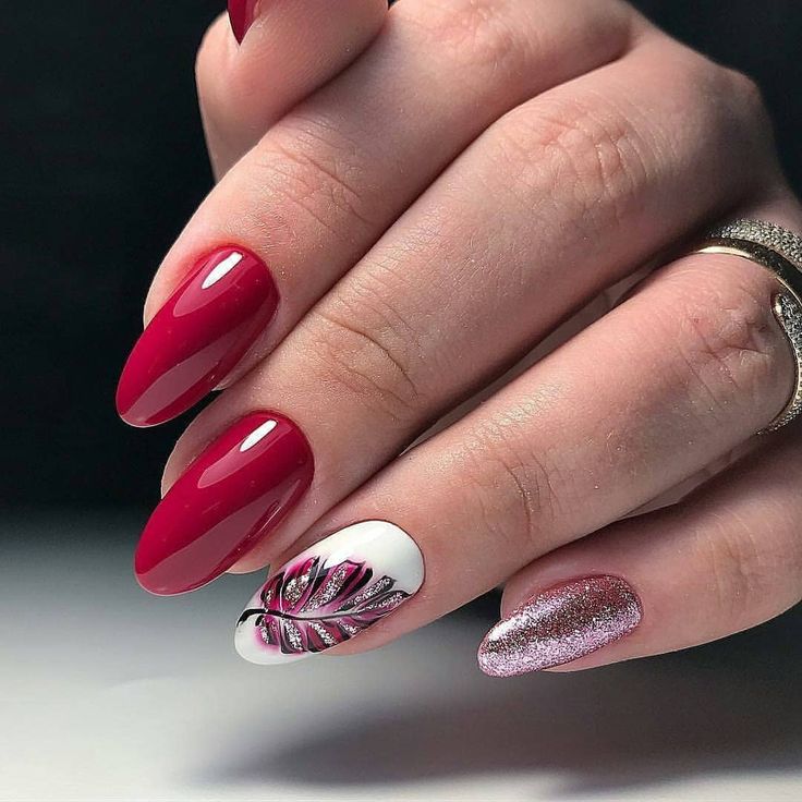 Хотите блестящий маникюр? Тогда наш следующий выбор для вас. Эти ногти имеют темно-красный лак с двумя акцентными ногтями. Один акцентный ноготь покрыт золотым блеском, а другой украшен мерцающими драгоценными камнями. Такие ногти идеально подходят для вечернего выхода. Вы можете выбрать только один из этих акцентных ногтей или носить оба.