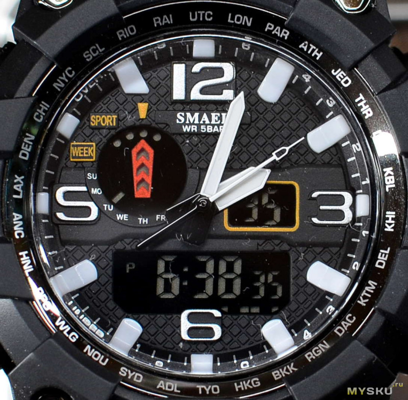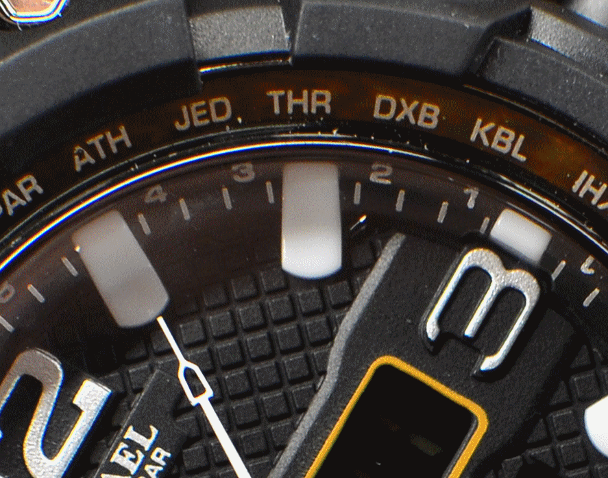 Окошко циферблата часов изначально было покрыто плёнкой. Материал — увы, пластик, будет царапаться, хотя не быстро, поскольку оно всё-таки утоплено в корпус. На внешней стороне циферблата нанесены 30 названий городов мира в виде сокращённых аббревиатур. В данном китайском случае это несёт чисто декоративный характер и пользы никакой не играет. По окружности циферблата с внутренней стороны нанесены тонкие секундные риски, а также массивные толстые часовые риски. Форма их мне не по вкусу, тем более риска на 11 часах — из-за оранжевой трапецевидной метки — усечена. Вообще реализция усечения одних элементов другими элементами интерфейса, что в дорогущих японских часах, что в этих — проработаны как-то небрежно с дизайнерской точки зрения. По окружности циферблата также нанесены мелкие цифры, их предназначение мне неизвестно. Про «тощий» шрифт крупных цифр 3-6-9-12 и 9-ку, превращённую в S я своё мнение уже высказал выше.