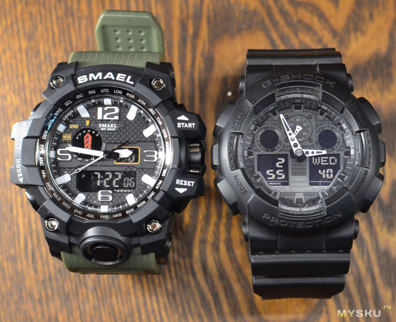 Когда-то я считал Casio GA-100 чересчур брутальными по дизайну часами и довольно крупноватыми по размеру, но в сравнении с китайскими Smael, я так уже не могу сказать. Картина уже меняется. Китайские часы — ещё крупнее, контрастная белая разметка и выступающие части корпуса делают их очень выделяющимися. Casio же на их фоне смотрятся уже как-то сглаженнее и аккуратнее — эта простота мне стала ещё больше нравится. Благодаря китайским часам с брутальным дизайном, я смог разглядеть свои часы под другим ракурсом и увидел в них для себя другое великолепие — в простоте. Интересный визуальный эффект. Но это, повторюсь, личное вкусовое предпочтение.