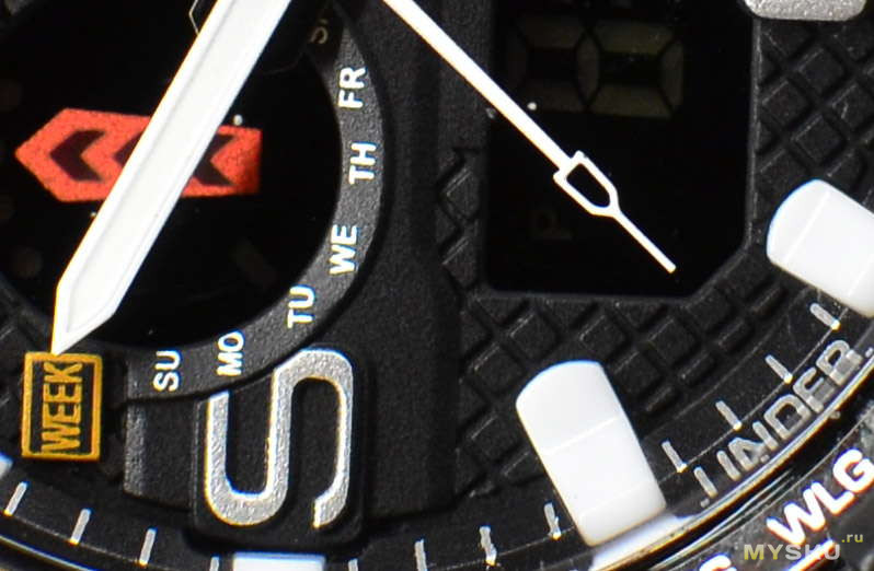 Общий стиль вывода времени — аналого-цифровой, т.е. в наличии работающие часовая, минутная и секундная стрелки, указывающие стороны которых окрашены в белый, а хвостовые части в чёрный цвет, причём хвостовики минутной и часовой стрелки перекрывают собой аббревиатуру дня недели Saturday (Суббота; в английском варианте отсчёт дней недели начинается с воскресенья (Sunday)). Однако метка, отмечающая актуальный день недели, остаётся видна всегда. Помимо дней недели в верхнем круглом окошке, мы можем заметить оранжевую стрелку с тремя меняющимися сегментами внутри, её функциональное назначение выяснить не удалось, ибо ни в инструкции, ни в обзорах также про неё не рассказывается.