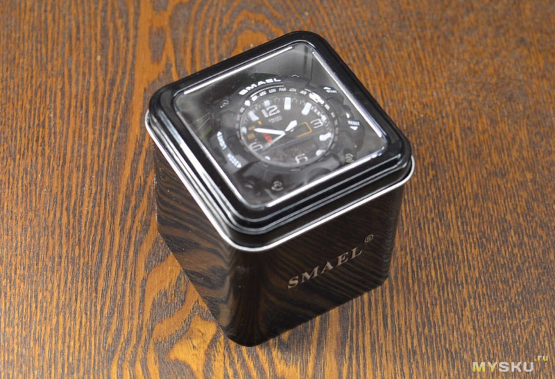 Несмотря на отправку из Китая, объявленный на странице товара срок доставки — до 15 дней. Мне посылка пришла за 12 дней. Продавец уже не Коллекция JD, поэтому изображение их логотипов на коробке уже отсутствует. На алиэкпрессе в официальном магазине SMAEL продавец отправляет часы и вдобавок кладёт ещё какое-то дополнение — либо запасную батарейку, либо ремешок — всё это упаковывает в обыкновенный мешочек. В моём случае продавец не похож на официала, однако часы, пришедшие от него, были упакованы в жестяную коробку с выдавленной надписью бренда часов. Окошко в крышке сделано из блистера.