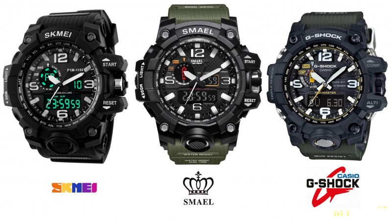 Дизайн часов SMAEL 1545, как некоторые уже догадались, копирует дизайн часов Casio GWG-1000-1A, которые стоят в 50 раз дороже, т.е. если средняя цена на китайские часы 10$, то «японец» обойдётся уже примерно в 500$ — он справа.