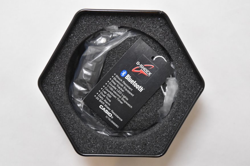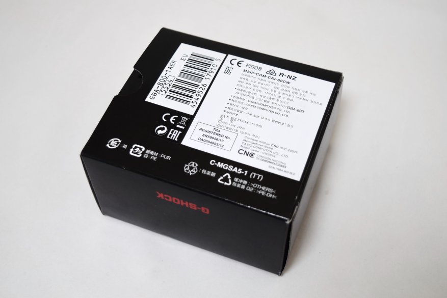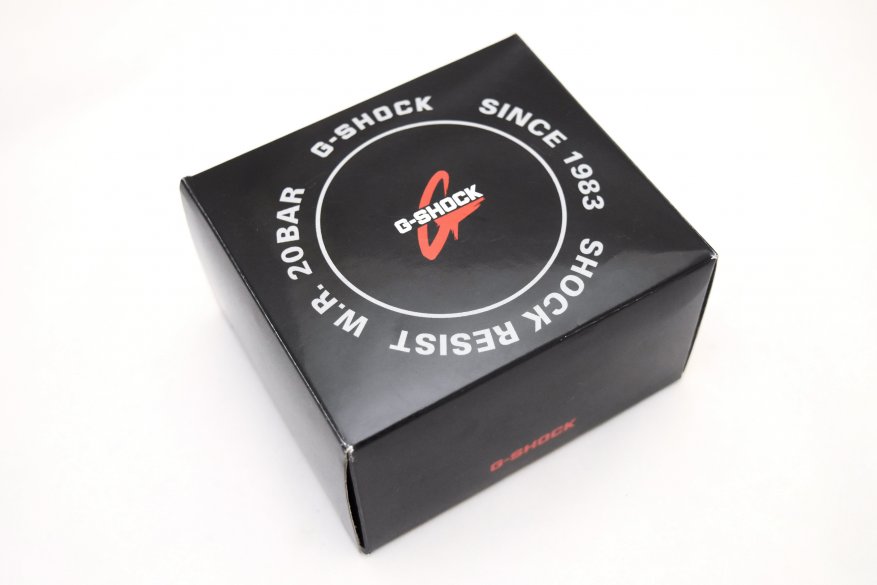 Сами часы упакованы в картонную коробку черного цвета, на лицевой поверхности которой есть информация о том, что это G-Shock, имеющий уровень защиты от попадания влаги W.R. 20 BAR.
