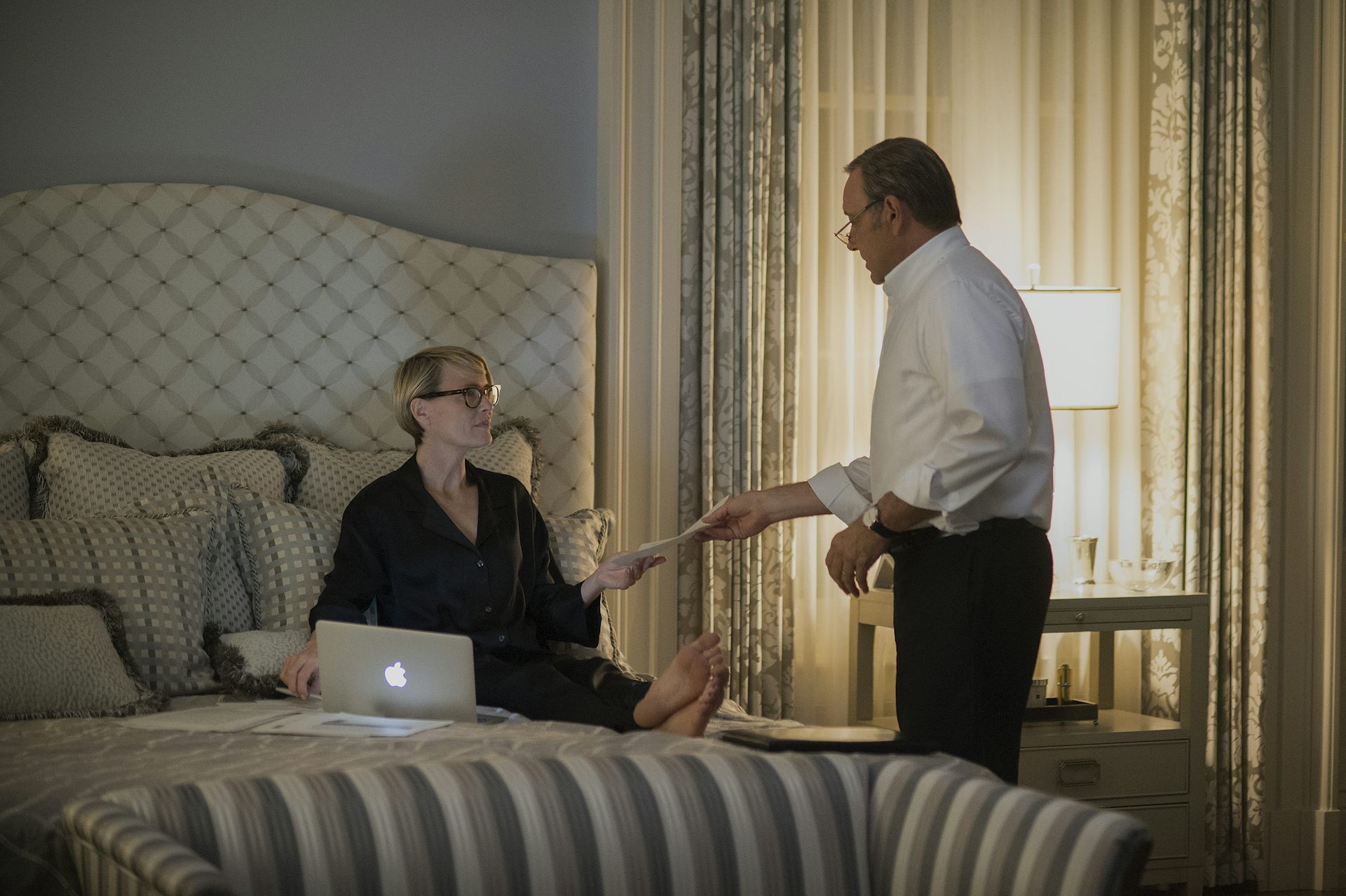 Сценаристы и Спейси решили, что это, по сути, будет игра, и он всегда будет стремиться к заднему ряду. Часть этого исходит из критики шоу, что политика — это просто театр, а власть развращает и пожирает душу, и что, поскольку Фрэнк говорит с нами, мы соучастники и все такое. Эти вещи также были темами в пилотной версии. Я понимаю.