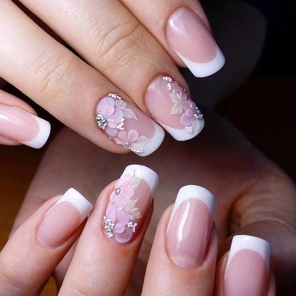 Инкрустированный френч — это, по сути, классический вариант нейл-дизайна, дополненный множеством страз, бульонов и камушков, оформленных в виде определенного орнамента. Зигзаги состоят из страз, полосок в виде колец, имитации красивого кулона и так далее. Рассеянные стразы дополняются узорами, например, популярным мотивом летних бабочек, обыгрываемым по-новому, усыпанным стразами. Еще один популярный вариант французского маникюра — это дизайн ногтя и его наполнение микросферами и частично стразами. Жакет со стразами может стать отличным вечерним дизайном для особого случая.