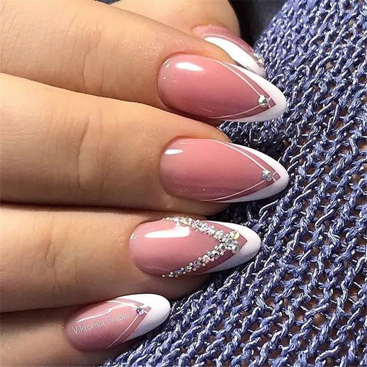 Разработано множество техник, которые смело объединяются в один дизайн, создавая комбинированный маникюр. Завораживающее разнообразие ярких камешков, блесток и наклеек притягивает, как магнит, и постоянно заставляет работать безграничную фантазию о маникюре. Обзор новых вариантов французского дизайна мы начинаем с уже полюбившейся новинки — новой формы дизайна ногтей со стразами — инкрустацией.