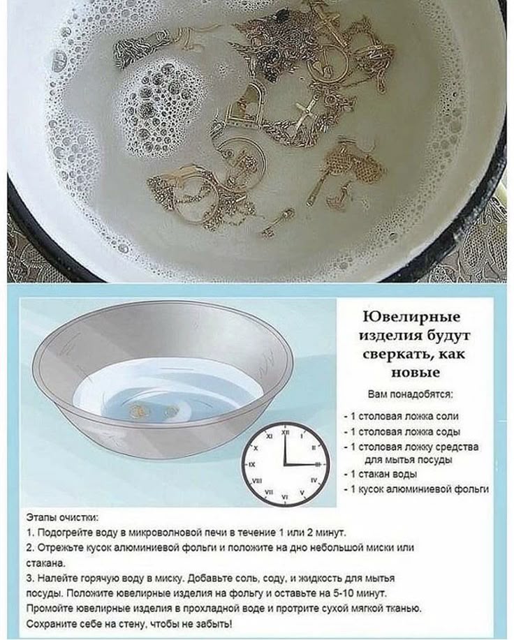 В домашних условиях применяют вот такой способ очистки: столовую ложку пищевой соды и несколько шариков из фольги помещают вместе с ювелирным изделием в подходящую емкость и заливают кипятком, оставляя на время (20–30 минут). Либо просто выстилают дно посуды листом фольги, а дальше используют те же ингредиенты и порядок действий. В Сети можно найти похожий рецепт, но с добавлением дополнительно столовой ложки соли.