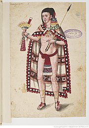 . У других плащей «на рыжевато-коричневом фоне были разбросаны бабочки, вытканные из белых перьев». Можно вообразить, какой фантастический эффект производила эта ярко расцвеченная одежда, особенно если учесть, что знатные люди могли надевать по 2-3 плаща одновременно!Одежда[ | ]