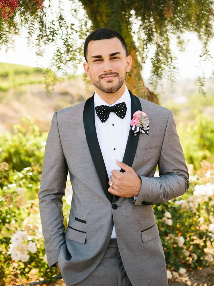 2. Кайл невероятно актуален в этом сезоне в темно-бордовом бархатном смокинге! Аксессуары, такие как часы с гравировкой, карманные часы и соответствующий бархатный галстук, означали, что Кайл был не чем иным, как щеголем, когда дело касалось его стиля жениха!
