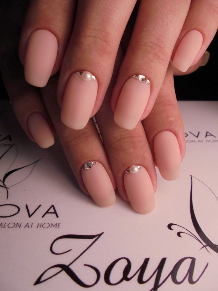 - Нюдовые оттенки великолепны в обрамлении одного-трех стразов, расположенных у лунулы ноготков.