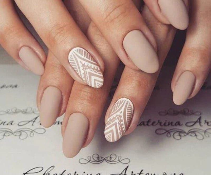 Но если лаконичность матового нейл-арта вам не по душе, но соответствовать модным тенденциям хочется, можно поиграть в контраст. Последний заключается в красивом соединении матового и глянцевого покрытия в одном цвете. Это может быть плоская или объемная фактура, красивые вензеля, кружева и так далее. Глянец может образовывать лунный или французский маникюр. Изысканным дополнением может стать осыпание единичного ноготка акриловой пудрой в тон.