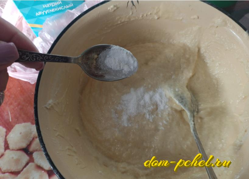 Постепенно подсыпайте просеянную муку с содой и замешивайте тесто.