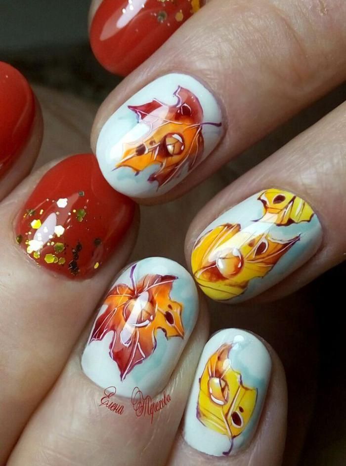 Фантазировать с рисунками можно бесконечно! Можно сделать основное покрытие в серой или шоколадной гамме, а затем нанести на него золотистые листочки при помощи стемпинга. Или же нарисовать белые контуры падающих листьев на блестящем фоне в осенних тонах.
