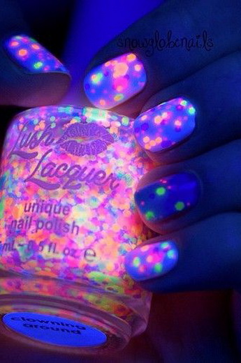 Это неоновые лаковые покрытия, которые пользуются особой популярностью у ценителей ночной жизни, ведь они проявляют себя именно под ультрафиолетом. Такие материалы, нанесенные на поверхность ногтевых пластин, в темноте под действием ультрафиолетовых излучений начинают светиться.