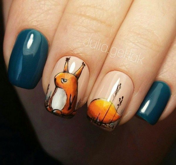 Игривая лисичка идеально впишется в дизайн осеннего маникюра благодаря своему шикарному окрасу. Вы можете на одном пальчике нарисовать милую мордашку животного, а на другом её хвостик или отпечаток лапки.