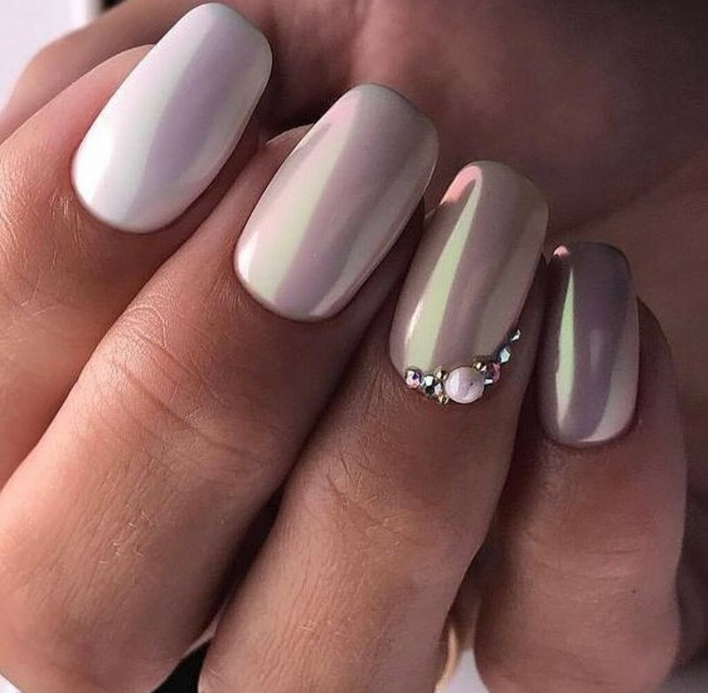 Перламутровый маникюр идеально дополняется стразами или блестками. Кроме того, даже однотонный перламутровый маникюр потрясающе смотрится в любом образе.