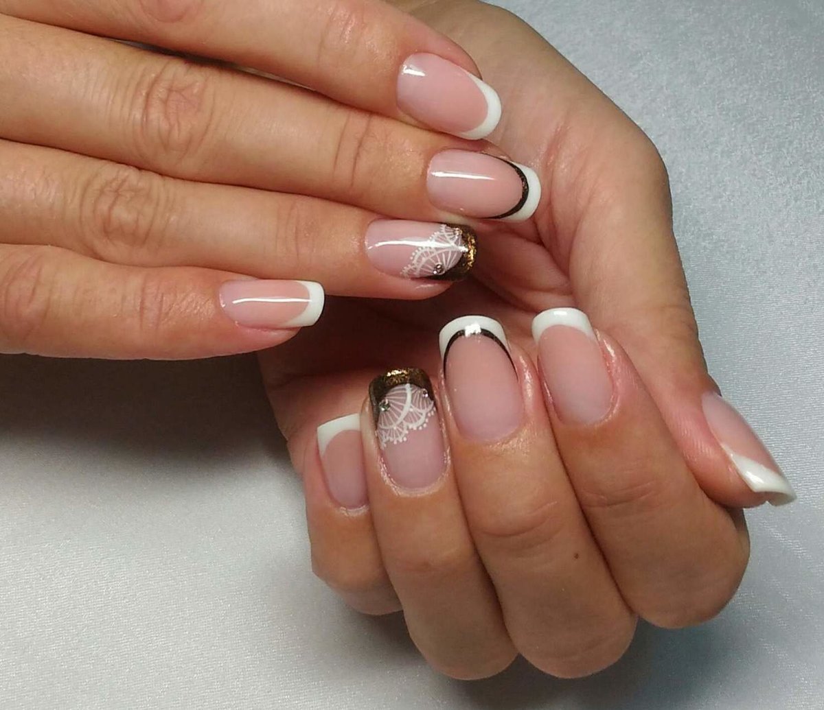 - Акцентируем внимание на деталях. Если вам кажется, что перламутр недостаточно сияет или хочется чего-то еще, то выберите ручную роспись на нескольких пальцах или вариант с декоративным кружевом. Такой маникюр будет смотреться не только стильно, но и нежно.
