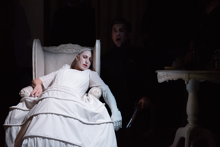 Когда Графиня поднимается из гроба в лучших традициях инсценировок гоголевского «Вия», в руке она держит главный символ спектакля — игральную карту. Дальше происходит фокус: карта сминается в руке и осыпается снежным конфетти прямо на голову оторопевшему у подножия гроба Герману. В следующей сцене у героя страшно выпучены глаза и шевелюра покрыта сединой. Именно в таком виде он, схватив кого-то из зрителей за плечо, поет: «Что наша жизнь — игра!»