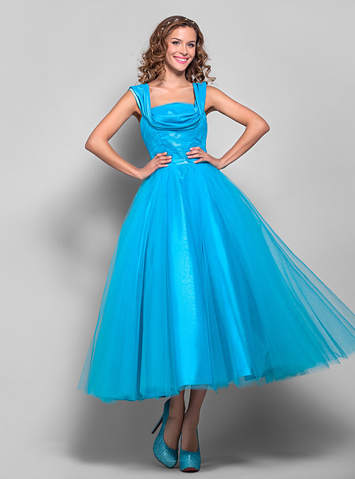 Синее полуформальное платье длиной до колен из тюля с вырезом через шею
