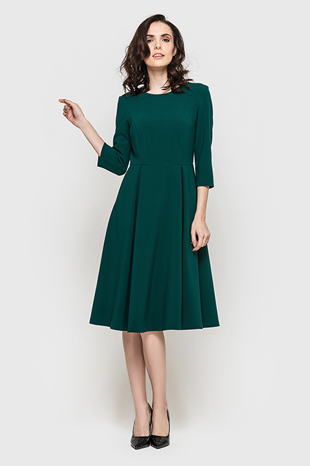 Изумрудный цвет стройнит, поэтому для полных женщин это платье актуально всегда. Можно подобрать изделие с баской, тогда удастся скрыть полный живот или отсутствие талии. Длина чуть ниже колена позволит сделать ноги более стройными и привлекательными.