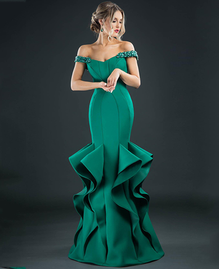 Трендовые фасоны и декор платьев в изумрудном цвете