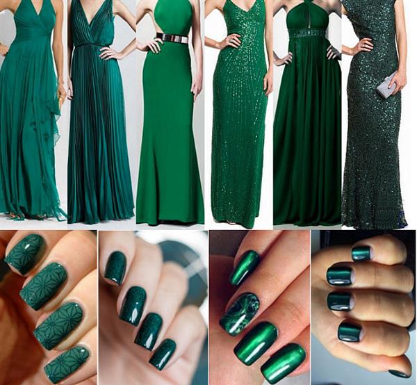 К изумрудному платью подходят бордовый, голубой, розовый и красный лак. Стильным решением является «велюровый» маникюр, который напоминает бархат либо нежную зеленую траву. Этот вариант подойдет только под платье из велюра либо атласа.