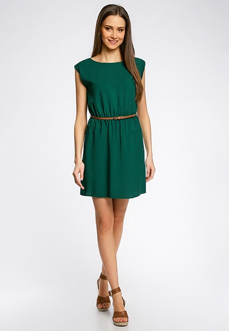 Весьма непритязательными являются короткие модели. Такие наряды станут прекрасной покупкой не только для лета, но и для осени. Драгоценные зеленые тона вдохновляют модельеров для создания красивых, изысканных нарядов. Нейтральный силуэт при грамотном выборе аксессуаров позволит воплотить любой облик. Короткие и миди варианты отлично смотрятся с открытыми босоножками и туфлями, а также с изысканными ботильонами.