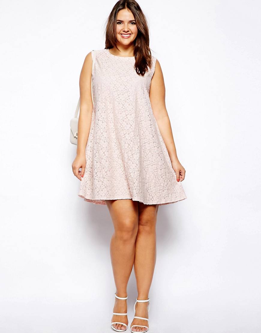 - А-силуэт. Базовый фасон для пышнотелых красоток. Он подчеркивает пышную грудь, скрывает живот и выделяет линию талии. По длине такие наряды должны доходить до линии колен. Также допускаются и макси модели. Что до тканей, они не должны быть слишком тяжелыми, дабы образ в результате не получился громоздким.