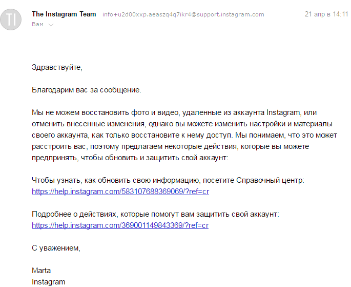 Как только вы отправите видеоселфи, чтобы помочь нам подтвердить вашу личность, вы получите электронное письмо от Instagram на указанный вами защищенный адрес электронной почты.