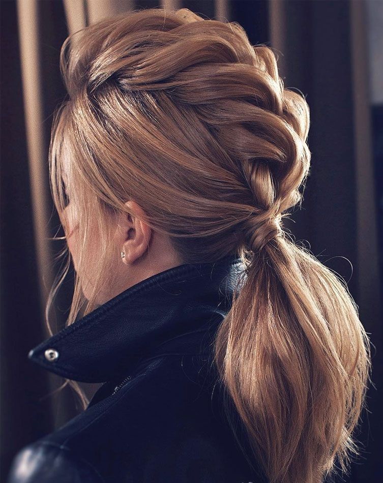 Пример прически показан на длинных волосах, но средней длины тебе более чем хватит. Главное, чтобы получилось заплести сзади косичку и ее было достаточно на один оборот вокруг хвоста. Смести прическу в бок, чтобы она смотрелась еще интереснее.
