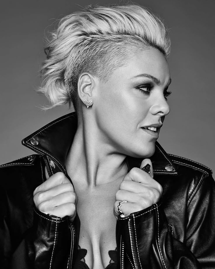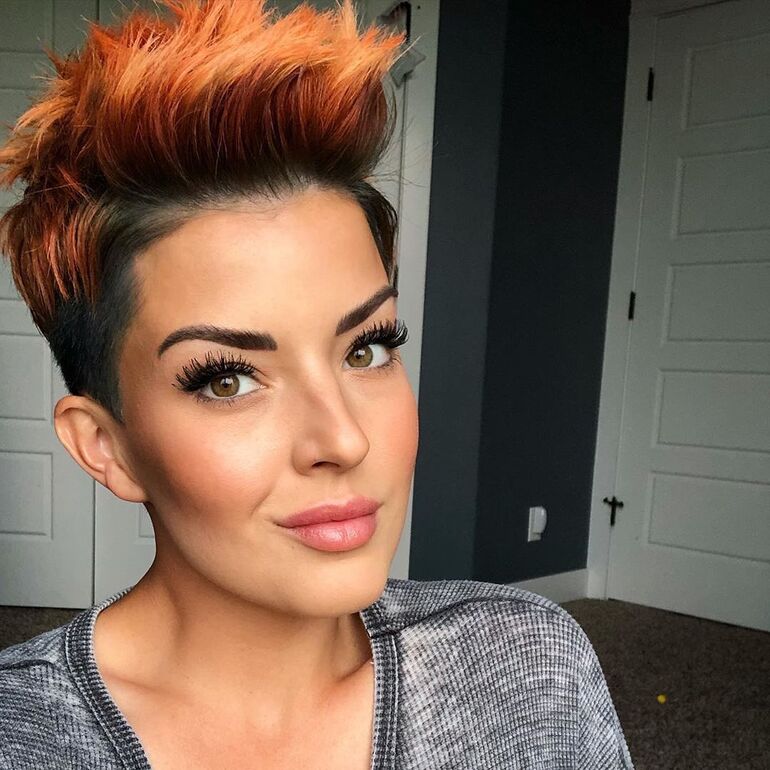 49. Колючая короткая прическа с блеклой стрижкой. Самая смелая женская прическа не для застенчивой девушки. Уложите свои яркие наполовину выбритые волосы пикси в виде шипов.