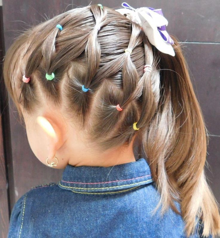 Если длина позволяет, то можно попробовать заплести маленькие косички. Каждую косичку украшаем тоненькими разноцветными резиночками или бантиками. Главное не перегружайте голову ребенка аксессуарами и объемными, громоздкими укладками — это все будет только ему мешать!