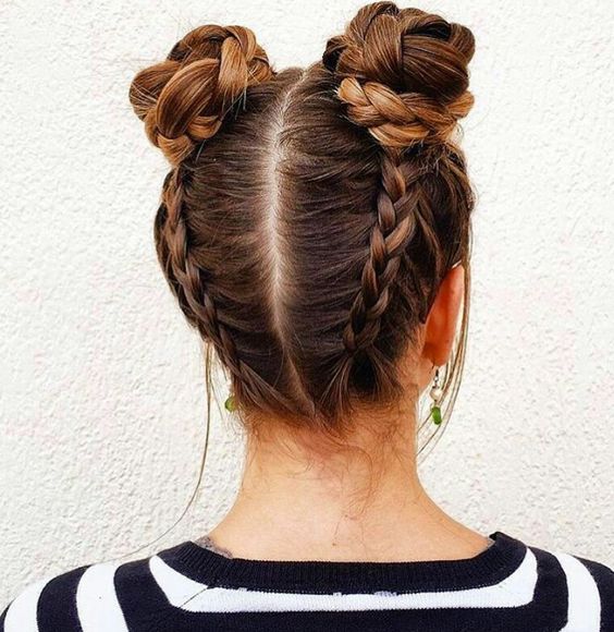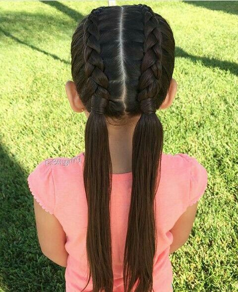 Не меньшей популярностью пользуются прически на основе кос. Это могут быть простые, привычные колоски или же чуть более сложный вариант, как на фото. Чтобы сделать данную прическу, разделите волосы на две части пробором. С каждой из сторон заплетите французскую косу и соедините их одной резинкой. Простая, но в то же время очень красивая прическа готова!