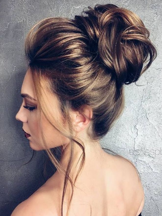 - Теперь соберите переднюю часть в высокий хвост, скрутите концы в пучок и закрепите шпильками.