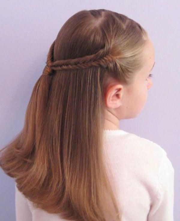 Такие быстрые детские прически на длинные волосы будут смотреться аккуратнее, если распущенной останется только часть шевелюры, а остальная ее часть будет собрана.