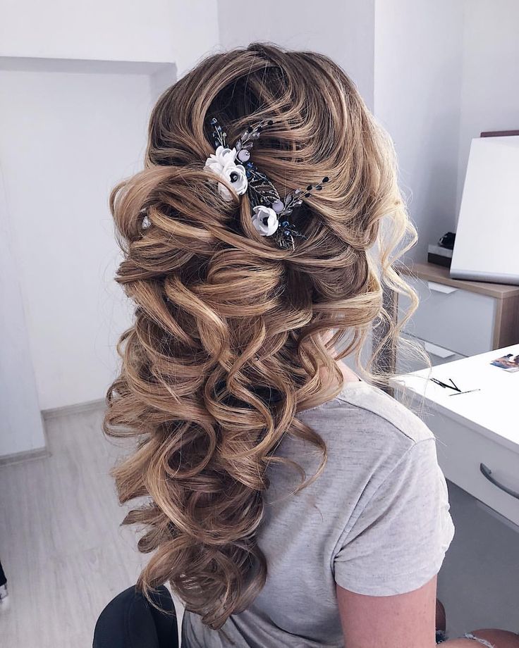 Подходит он утонченным и романтичным натурам, а смотрится аккуратно и естественно. Для такой укладки важны кудри. Если природа ими не наградила, можно создать их при помощи плойки или бигуди. А собрать длинные волосы и уложить на бок, оформив в праздничную прическу, не займет много времени. Рассмотрим самые интересные и популярные идеи по созданию такого образа, который впишется в формат любого праздника.