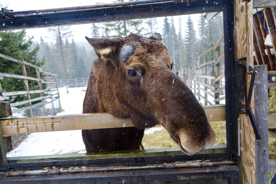 Просто лось — Столица СОднажды мы с путешественником Денисом Петровым заплутали в лесах Пензенской области. Искали деревеньку Николо-Райское, определяли направление по грибам на пнях и по редкому свисту птиц. В золотую осень. В погожий прозрачный денек. А дорога сужалась-сужалась и вовсе спряталась в березняке. И вдруг из кустов выехала лосиная морда. Потом рога. А потом и весь лось. Смотрит на нас и молчит. И мы робеем. Ну и ушел он. Одиноко ему гулять по лесам. А уж как вернулся к нам дар русской речи, Денис Петров закричал вслед зверю: «Лось! Ступай в Мордовию! Там твои братья!» В нашем-то заповеднике лосей под сотню! Они семейно ходят по сосняку, лежат парами на еланях, а иногда соберутся всем коллективом и ждут, когда Александр Борисович Ручин лично сунет каждому в теплые губы ржаную горбушку.