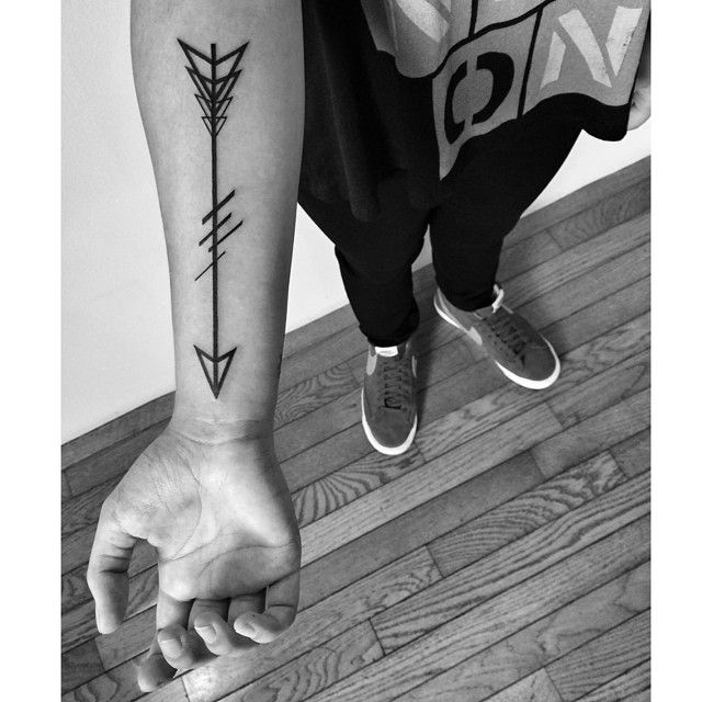 Еще одна маленькая татуировка со стрелой на предплечье.Комбинация разных татуировок
