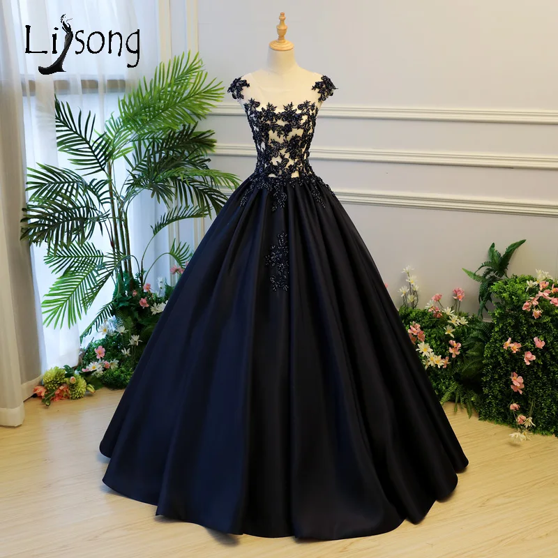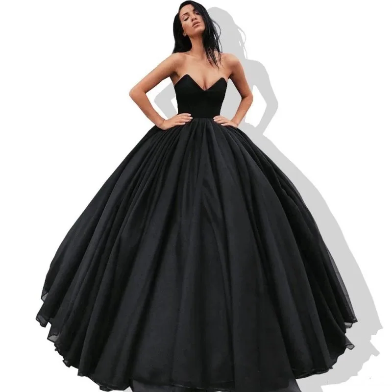 Фотомодель в роскошном пышном черном платье лежит на полуPREMIUM