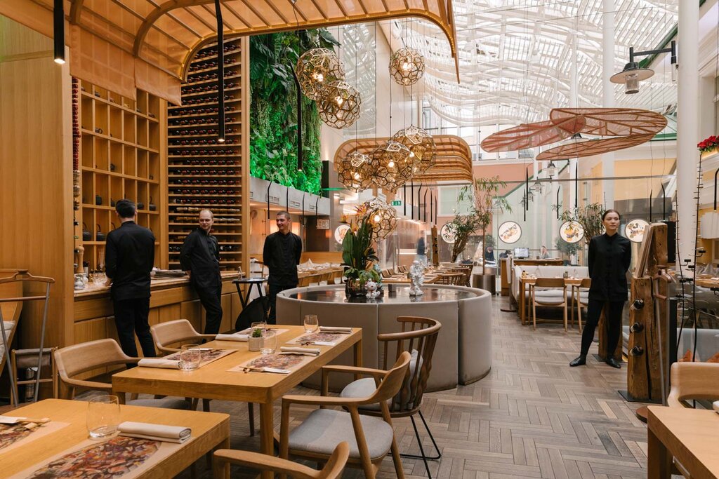 Этот старинный ресторан, специализирующийся на первоклассной украинской и русской кухне, также известен своим застекленным двором-атриумом, где живут павлины, кролики, куры, фазаны и даже коровы; необычная таблица для ужина.Остальная часть интерьера, с современными стульями с цветочным рисунком, деревянными полами и более чем сотней дизайнерских ламп, а также шикарной открытой кухней с барной стойкой, дает понять, что это современный опыт, но меню остается верным подлинно созданной классике, такой как борщ (фирменное блюдо ресторана), русские салаты, блины и соленья, а также огромное количество сала. Есть и сезонный, и региональный аспект — зеркальный карп из Вологодской области, поросенок из Рязани, белые грибы из Урала, — а карта вин считается международной.