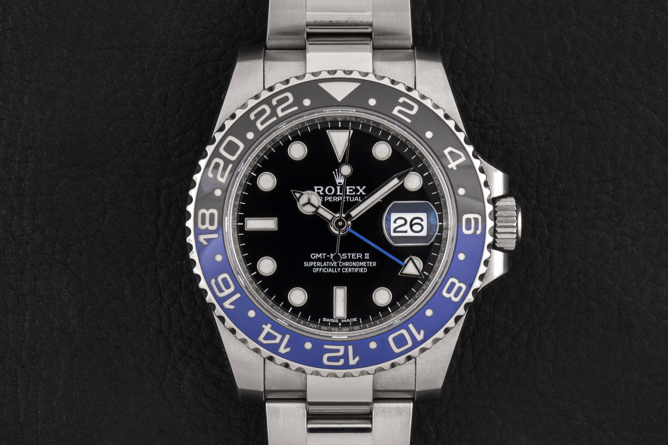 Циферблат GMT‑Master II с традиционными стрелками часов, минут и секунд, 24‑часовой стрелкой с треугольником на конце и вращающимся в двух направлениях безелем с градуированной 24‑часовой шкалой на диске Cerachrom отображает местное и справочное время или местное время и время любого другого часового пояса.Калибр 3285 часов GMT‑Master II оснащен механизмом, который позволяет свободно устанавливать местное время с помощью заводной головки, не останавливая при этом часы и ход 24‑часовой стрелки. Поэтому обладатели этих часов могут одновременно читать как местное время, так и время домашнего региона.