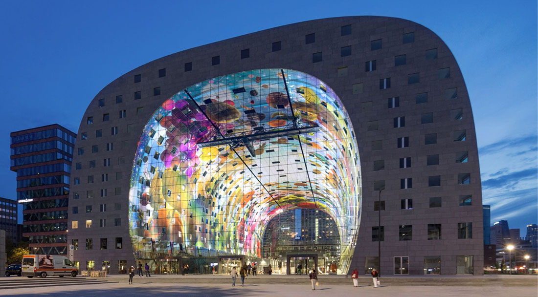 Теперь в самом центре Роттердама, в историческом районе Laurenskwartier располагается огромное подковообразное здание, где можно заниматься шопингом, обедать на террасе и жить в пентхаусе. Чтобы привлечь как можно больше посетителей, рынок был спроектирован по принципу максимальной прозрачности, хотя это не мешает ему быть закрытым со всех сторон. Через толстые стеклянные стены, возведенные в торцах, посетителям открывается впечатляющий вид на город, а прохожие с улицы могут разглядывать удивительные потолочные изображения.