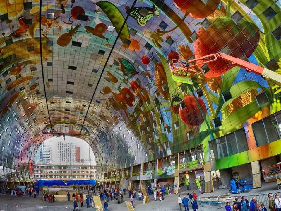 Такой вот рынок открыли в Роттердаме всего год назад. Его строили 10 лет, и результат превзошел все ожидания, даже ожидания архитекторов и оформителей. Они рассказывали прессе, что не предполагали, что получится настолько красиво. На открытии рынка присутствовала нидерландская королева Максима.