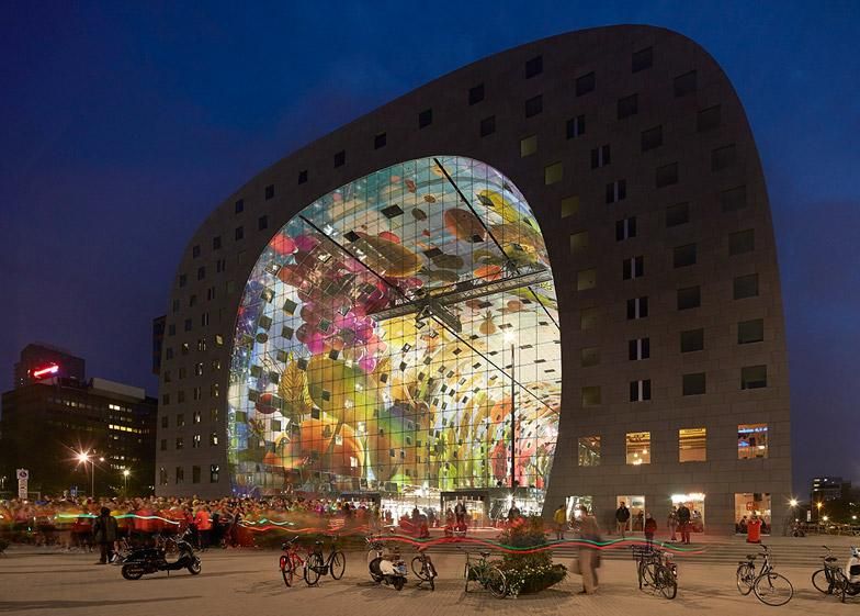 Здание было спроектировано голландской архитектурной фирмой MVRDV и помогло Роттердаму прочно закрепиться на карте мира. Состоящий из большой 40-метровой арки , он предлагает крытую рыночную площадь размером с большое футбольное поле с примерно 100 продуктовыми лавками и 20 магазинами и ресторанами. Каждый конец закрыт стеклянным фасадом для защиты от непогоды.