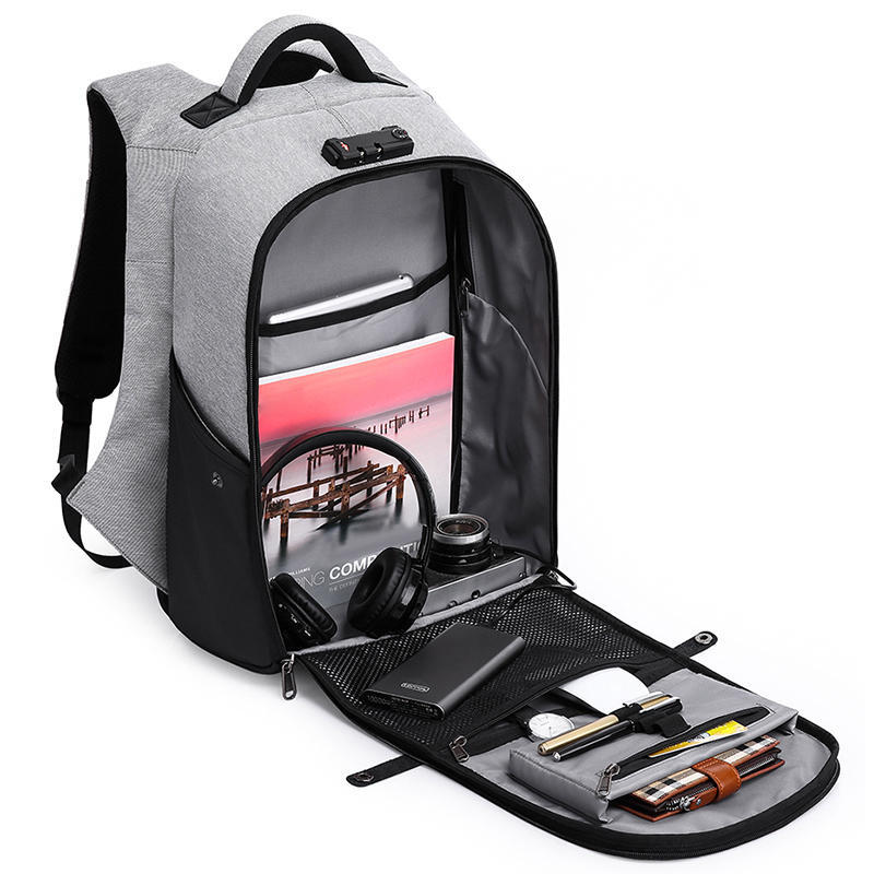 Спереди есть один большой карман на молнии, спрятанный в шве. По бокам — два держателя на кнопках, для бутылок воды или зонтов. Внутри на спинке размещены мягкие карманы для 15-дюймового ноутбука и 10-дюймового планшета, а также отдельный карман для повербанка. Над последним есть отверстие для провода: пропускаете его и заряжаете гаджеты, не вынимая аккумулятор из рюкзака. На второй половине рюкзака размещен «органайзер» для мелочей, в том числе — карман с экранированием для карточек.