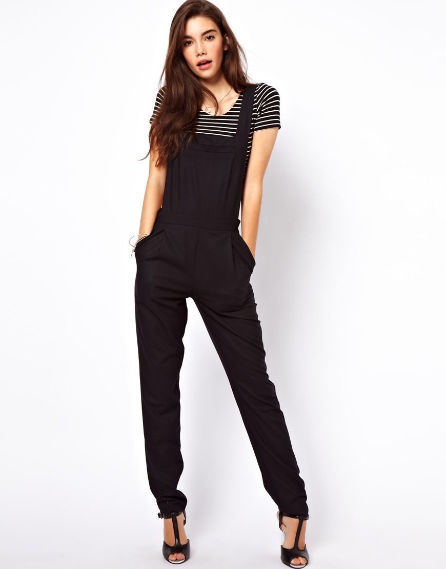 В целом же выбор дополнений напрямую зависит от общего стиля и цветовой гаммы комбинезона. Самым универсальным решением является черный предмет одежды. . Такие вещи выглядят очень сдержанно и при этом удивительно элегантно. Чтобы привнести в образ изюминку, следует подобрать модные аксессуары. Обувь в данном подойдет черная. Она может иметь небольшие блестящие украшения.